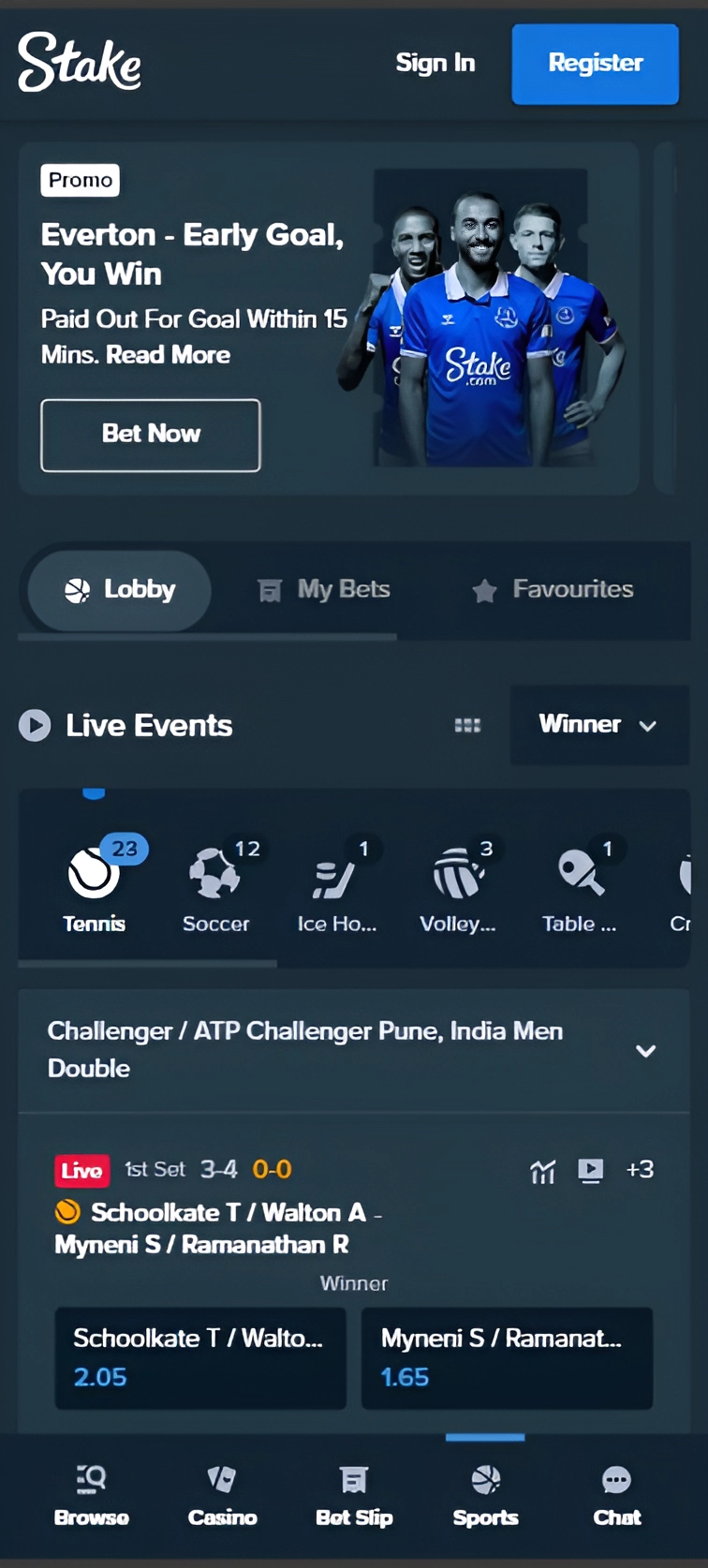 Along with multiple gambling services, the Stake mobile app provides a wide choice of betting options to Indian users. As soon as you proceed to the sports section via the main menu, you will be able to access more than 30 traditional types of sports and 10+ esports. Different kinds of bets can be placed in the app as well: short-term and long-term, pre-match and in-play, etc.